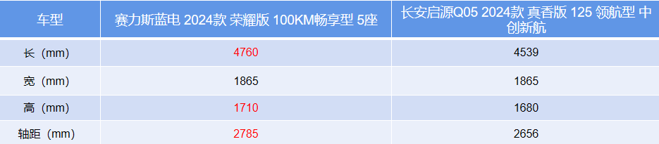 从两款车的定位上来看,蓝电E5荣耀版定位于中型SUV,车身尺寸为4760*1865*1710mm,轴距为2785mm。而启源Q05真香版定位于紧凑型SUV,车身尺寸为4539*1865*1680mm,轴距为2656mm。