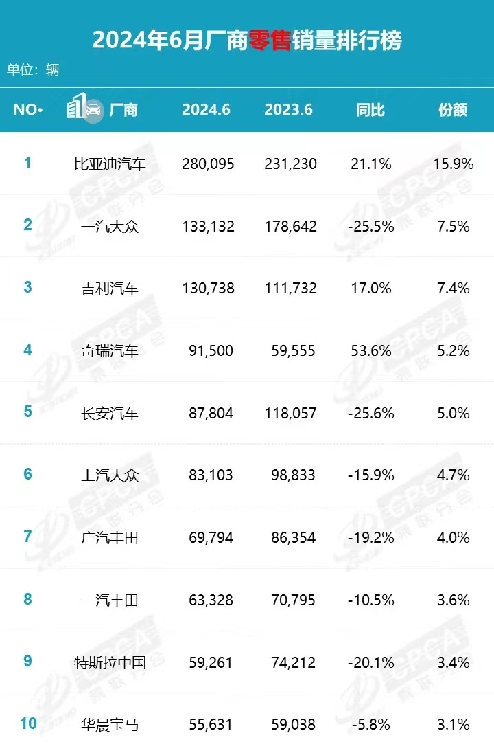 长安在6月销量8.8万辆,同比下滑了25.6%,是厂商前十榜单中下滑最大的车企,长安目前最大的问题就是缺少爆款产品,尤其是在新能源产品上,深蓝、启源都缺少标杆性的产品,不知道深蓝在搭载华为智驾之后,能否受到消费者的认可。