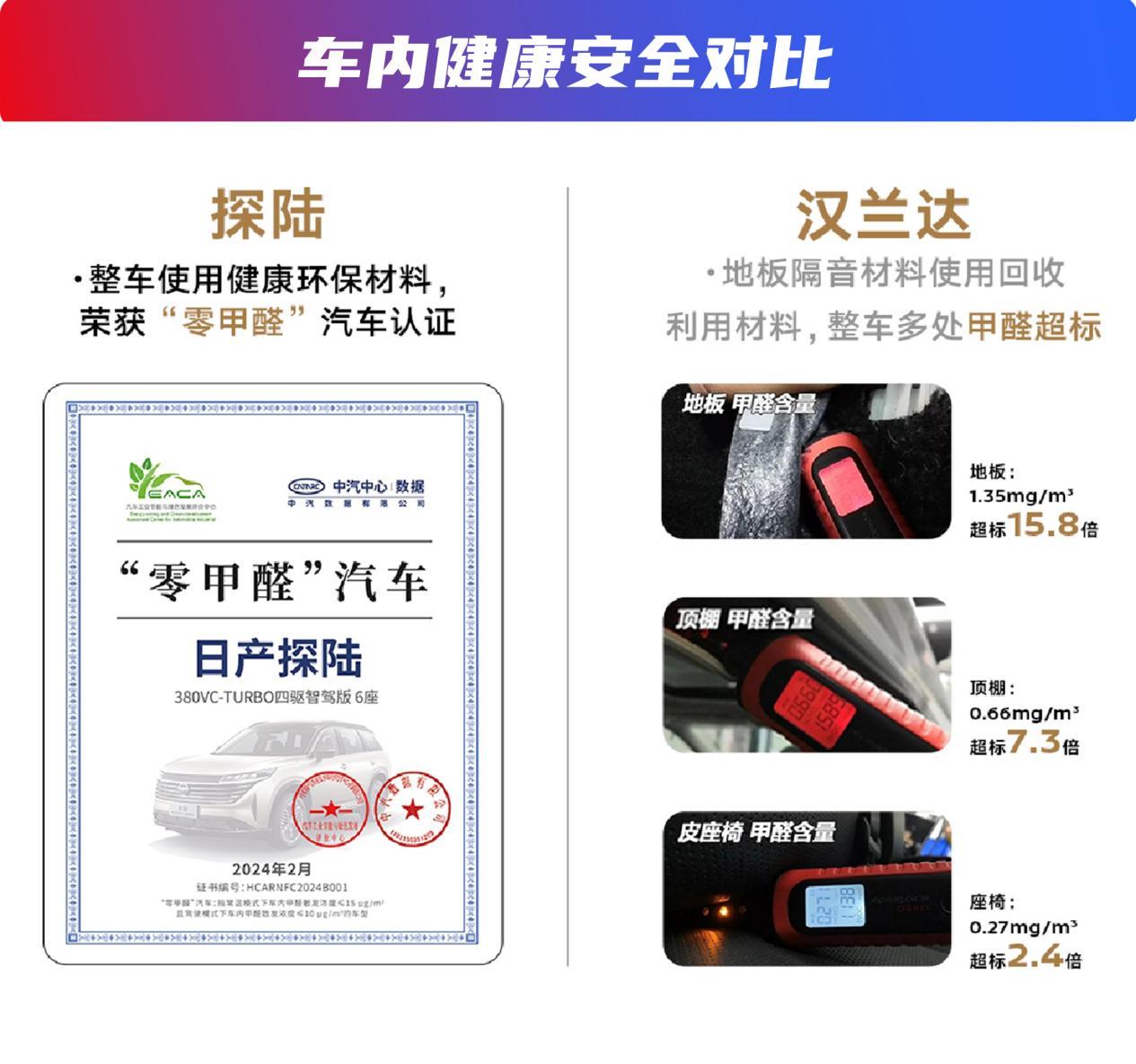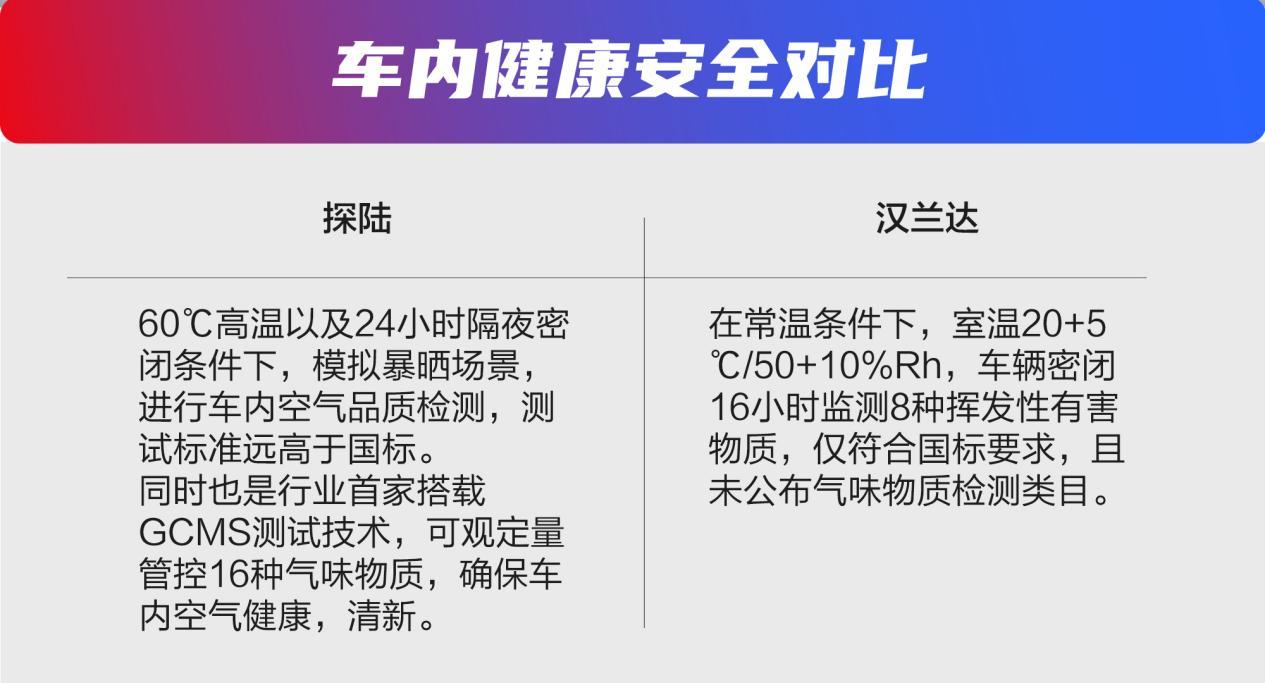 而在看不见的地方,探陆的安全表现依然更强。探陆整车采用环保材料,具备“零甲醛”汽车认证,汉兰达则在地板、顶棚以及座椅等多处采用回收利用材料,甲醛超标较为严重。