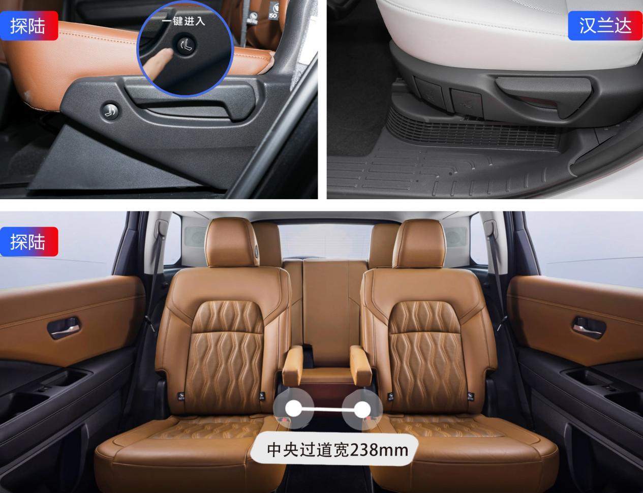 探陆不仅留出了人性化中央通道,还能够提供第三排一键进入功能,家中的老人小孩入座也能够轻松操作,汉兰达则需要用力扳动拉杆将座椅推移,没有那么轻松。