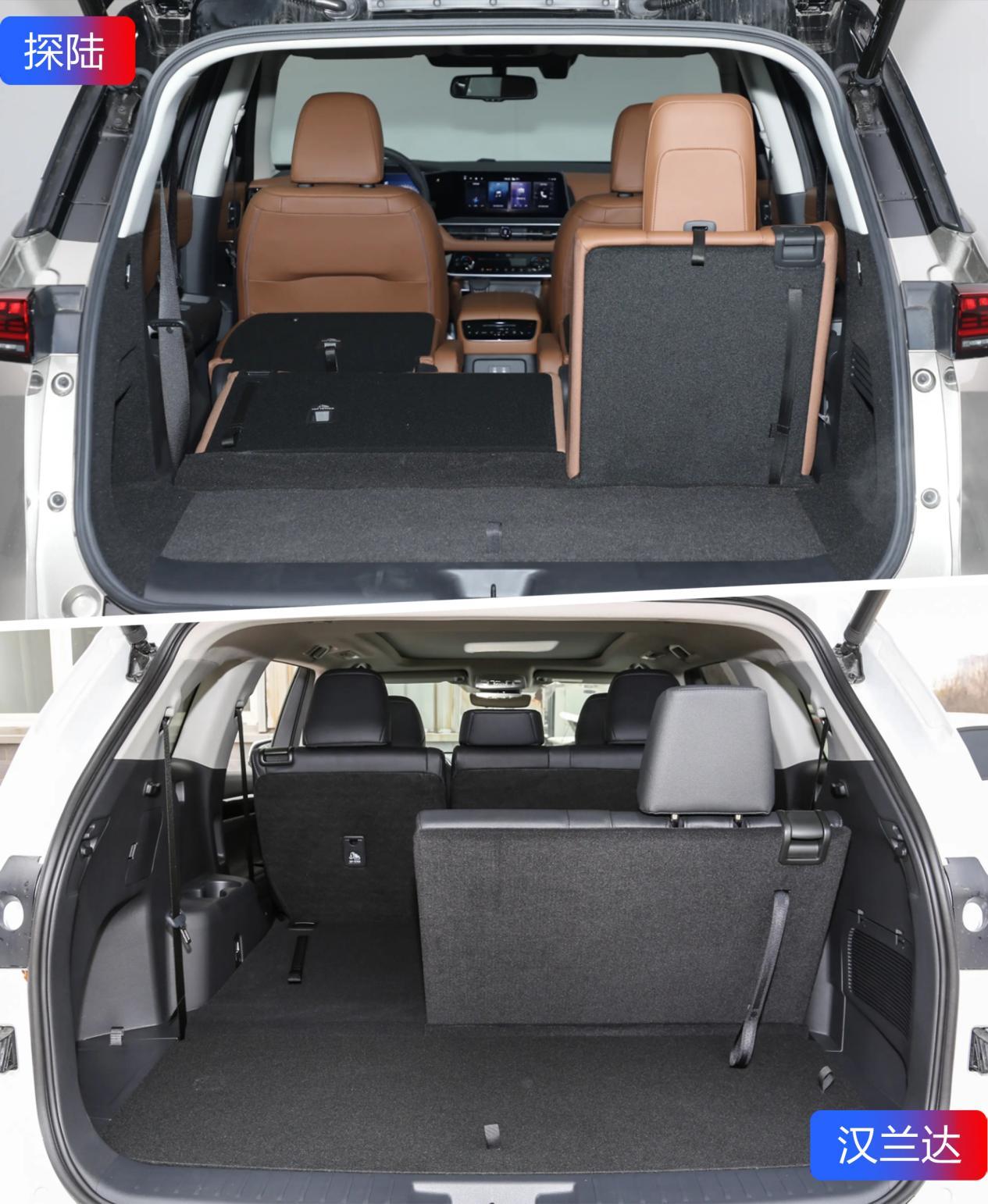 后备厢进深方面两车表现相近,不过探陆内部竖向空间更高,还能提供34L的下沉式储物格,储物能力更强,放置全家每位成员的行李物品都更加从容。比较可惜的是,汉兰达二、三排座椅放倒后无法形成一个完整的平面,对储物空间有一定影响。