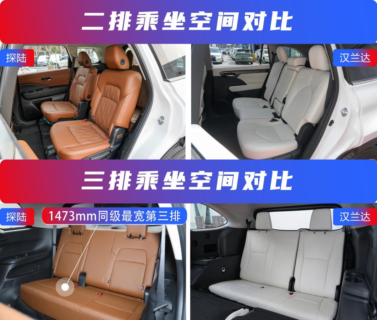 探陆超过5.1米的车长在纵向空间的表现上得以很好体现,不仅第二排座椅的腿部空间比汉兰达更富余,第三排乘客乘坐也没有出现顶腿的情况。汉兰达的第三排座椅则显得略有憋屈,正常身材的成年人入座膝盖会顶到第二排靠背,腿部空间较为局促,且坐垫高度比探陆矮了不少,坐进去更像是小马扎。