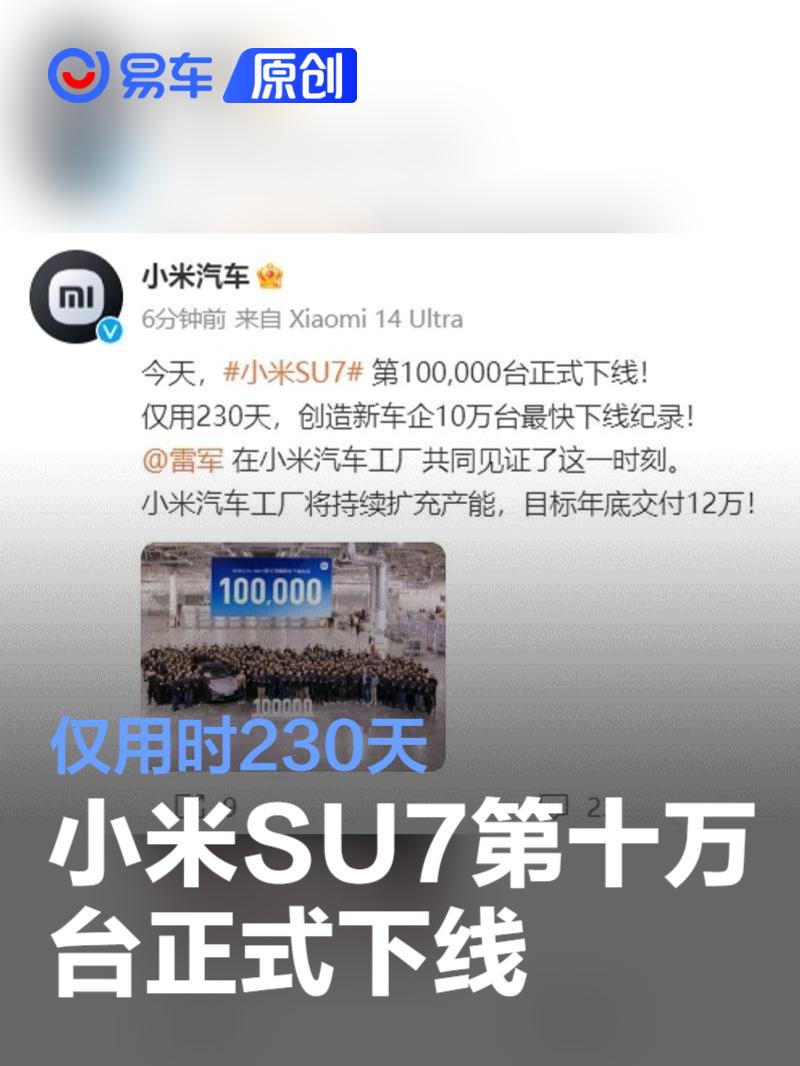 (原标题:小米SU7第10万台正式下线,仅用时230天/目标年底交付12万台)
