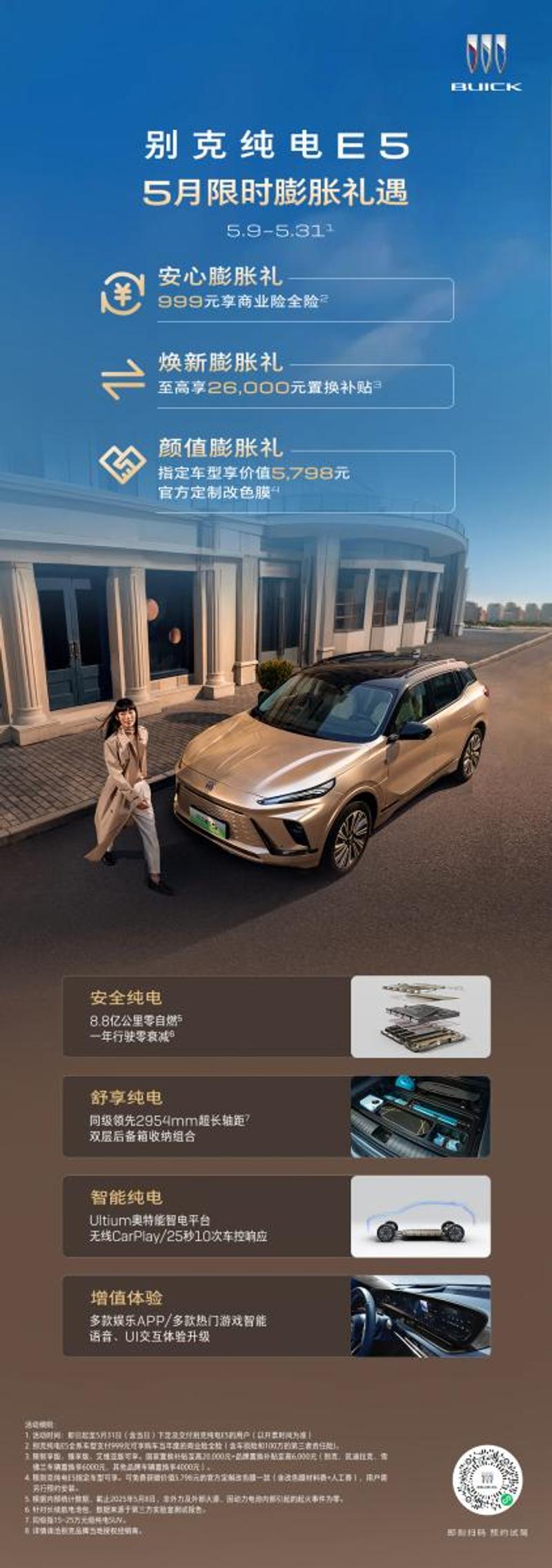 (原标题:别克纯电E5推出5月限时膨胀礼遇,999元可享商业险全险)