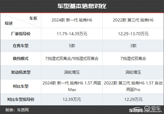 2024款新一代哈弗H6共推出了5款车型,相比2022款第三代哈弗H6增加了2款车型,消费者有更多的选择余地。售价方面,新款车型的起售价降低了5000元,顶配车型的售价上涨了6900元。为了更直观地进行对比,我们选择了两款售价相近的车型进行对比,两者差价仅1000元,可以更加直观地看出新老款车型在配置层面的具体差异。