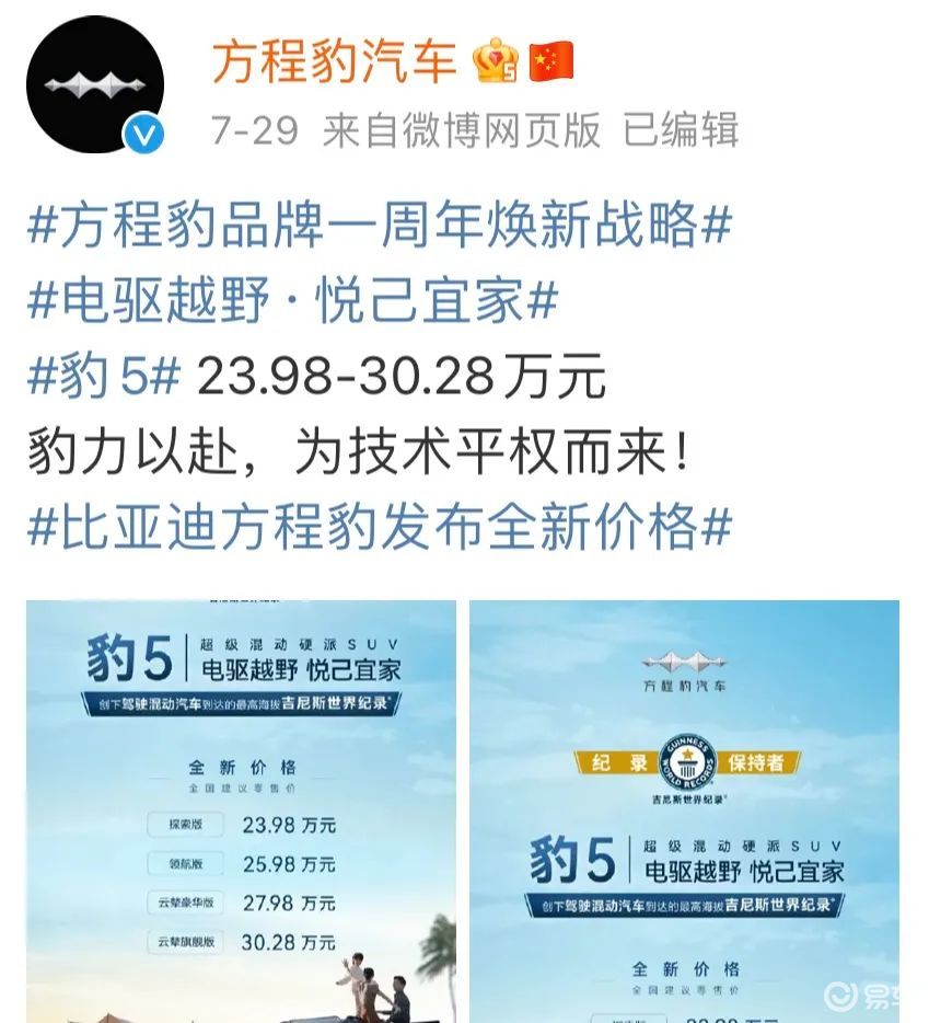 比亚迪又出手了。方程豹豹5日前公布了全新价格:23.98~30.28万元,同时,方程豹品牌在直营之外开放经销商渠道——显然,豹5做好了放量准备,要把“硬派越野”推向大众化市场。