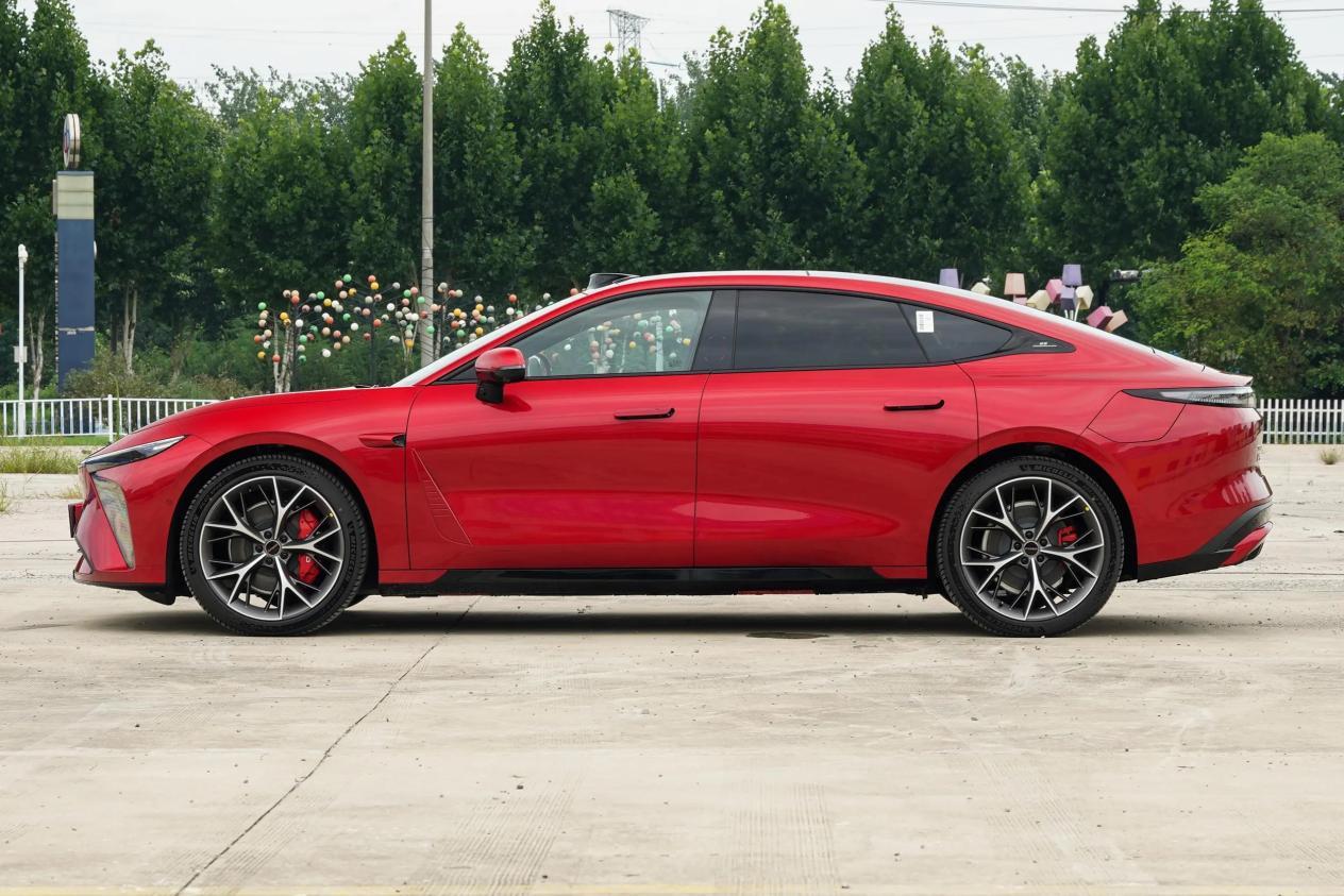侧面溜背造型,车身造型简洁,配隐藏式门把手和低风阻轮毂,车尾部分配备贯穿式尾灯组,下包围是尺寸较大的扩散器,带来不错的运动感。新车提供5种车身配色供选择,其中晨曦红是新增配色,另外还有极光紫、淡天青、旷野绿色和极夜黑色。