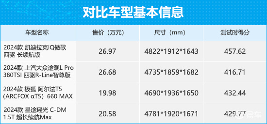 综合来看,上述四款中型SUV的整体表现都还比较不错,能够满足日常使用所需。其中,凯迪拉克IQ傲歌的得分最高,各方面表现也都很均衡,唯独后排座椅的测试成绩稍微有些“拖后腿”;极狐阿尔法T5和星途瑶光C-DM作为自主品牌的代表车型,同样保持了较高水准,整体表现能够令人满意。相比之下,上汽大众途观L Pro虽然在客观数据和主观感受方面的整体表现达到了专家评审团预期,但是在一些方面确实还存在优化空间,例如车身工艺、漆膜喷涂均匀性以及车内空气质量。消费者可以根据个人喜好以及关注点进行权衡后,再做选择。