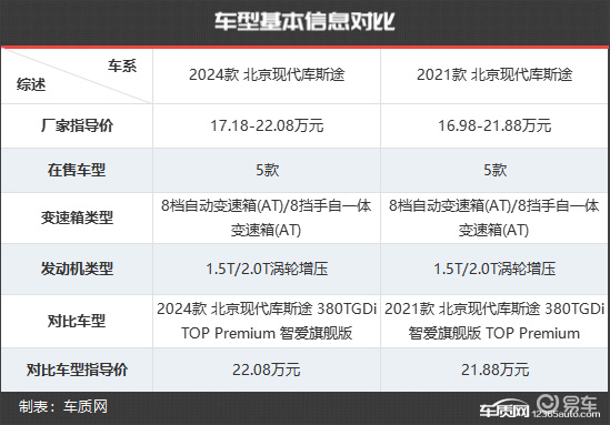 2024款北京现代库斯途共推出了5款车型,与2021款车型保持一致。售价方面,新款车型的起售价和顶配售价都有小幅度上涨,售价区间为17.18-22.08万元。为了更直观地看出新老款车型在配置层面的具体差异,我们选择了两款顶配车型进行对比,两者相差仅2000元。