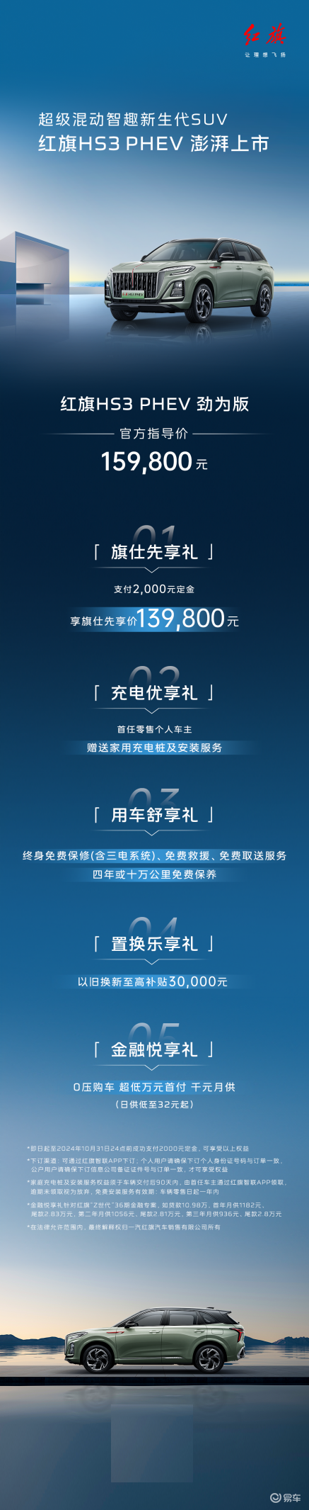 购车政策方面,红旗HS3 PHEV的优惠力度毫不含糊。凭借2000元定金,消费者可享有139800元的超值购车价格,这一策略无疑为那些期待拥有高端智能汽车的消费者打开了大门。此外,首任个人车主将获得价值5000元的家用充电桩及安装服务,此举大大降低了电动车日常使用的门槛。另外还有终身免费保修(含三电系统)、免费救援服务以及四年或十万公里的免费保养。