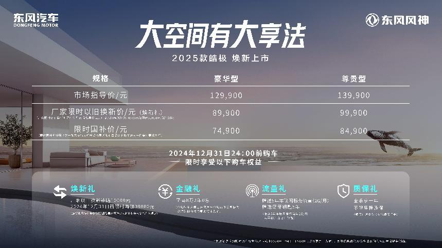 随着直播发布会的深入进行,越来越多的用户被2025款皓极的魅力所吸引,他们积极参与互动环节,提问、留言、分享自己的用车心得,现场气氛热烈而欢快。在发布会接近尾声时,2025款皓极的发布价格也终于揭晓,其中,豪华型指导价129900元,尊贵型指导价139900元。用户于2024年12月31日24:00前购车可享四重购车礼遇,分别是——焕新礼:以旧换新补贴10000元,2024年12月31日前限时再加30000元,即豪华型换新价89900元,尊贵型换新价99900元;金融礼:至高8万3年0息;流量礼:赠送5年车联网服务流量(2G/月),赠送蓝牙钥匙5年;质保礼:全系享十年不限里程质保。值得一提的是,根据国家《关于加力支持大规模设备更新和消费品以旧换新的若干措施》的规定,符合此政策要求的消费者,还可再享限时国补价,即豪华型换新价74900元,尊贵型换新价84900元。具体优惠政策及价格,请详询东风风神品牌经销商。
