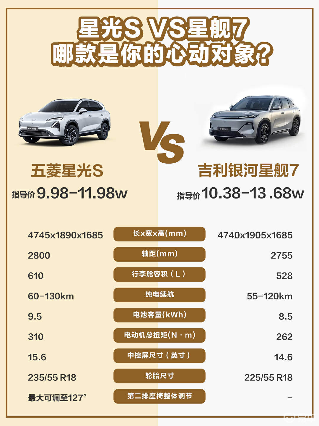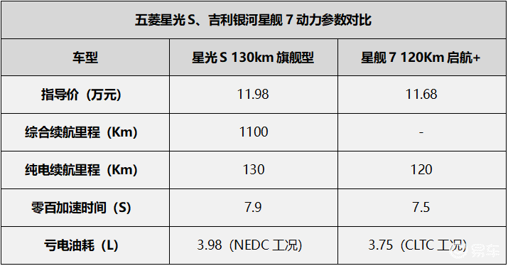 我们选取指导价11.98万的星光S 130km旗舰型和指导价11.68的星舰7 EM-i 120km 启航+版本进行对比,看看两者谁更强。