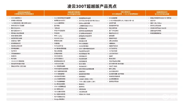 在舒适性方面,凌云300T超越版的车身尺寸为4780*1890*1730mm,轴距达到了2800mm,为乘客提供了宽敞的车内空间。二排膝部空间更是达到了139mm,进一步提升了乘坐舒适性。智能互联方面,新车搭载了高通骁龙8155芯片,保证了车机的流畅运行。同时,24.6寸环抱式真曲面屏、SONY音响、50W手机无线快充等配置也一应俱全。