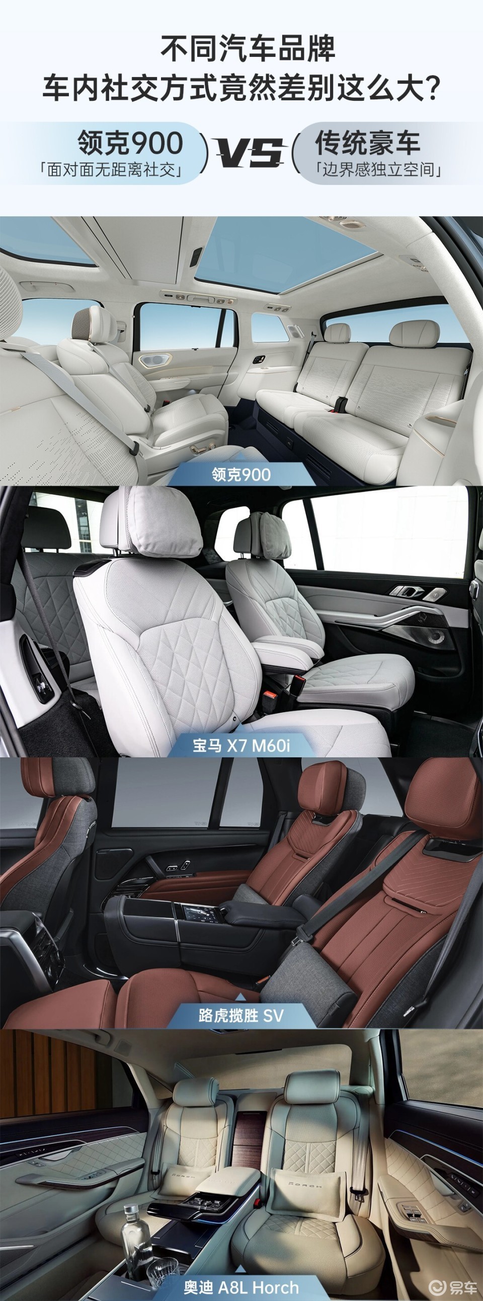 同样是一辆车,#领克900 选择打破空间束缚,开启面对面零距离交流,而传统豪车依旧坚持独立空间。