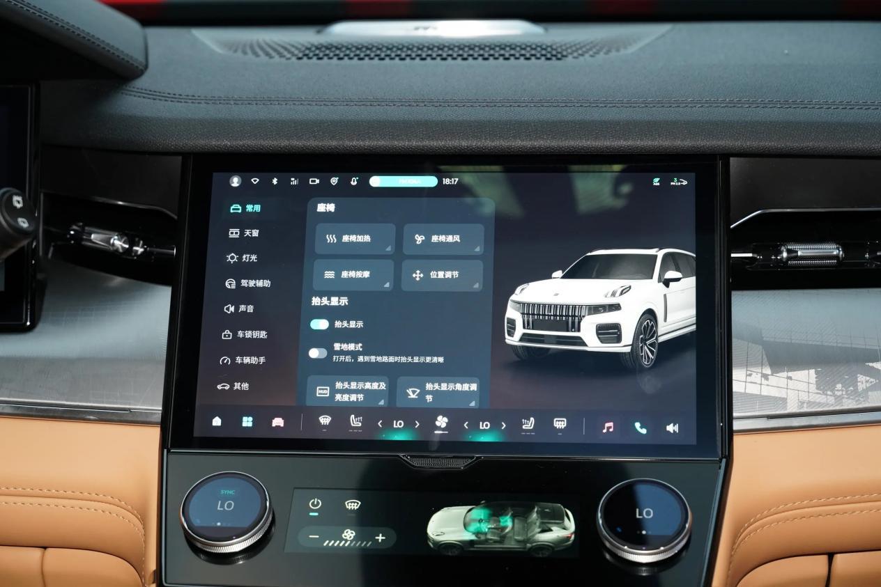 进入车内,领克09的内饰以“沉浸式豪华”为核心,采用大面积软性材质包覆与NAPPA真皮拼接,缝线工艺细腻。配备12.3英寸全液晶仪表与12.8英寸HUD抬头显示联动,车内还配了一块6英寸的触控屏和2个旋钮用来控制空调等功能。
