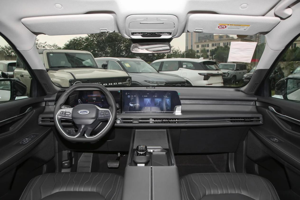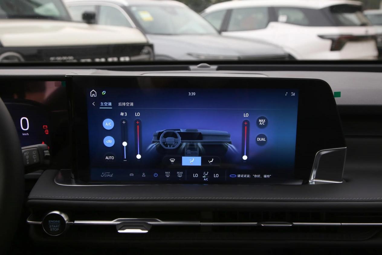 配备SYNC+智行系统,界面简单,中控屏操作流畅度尚可,不过功能布局还是比较清晰的,用起来还挺方便,车内简化了不少按键,常用的空调控制也是通过屏幕或者语音来控制,语音交互支持固定指令。车机生态以基础导航与音乐功能为主,缺乏第三方应用扩展。未配备HUD功能,驾驶信息需通过仪表盘或中控屏查看。
