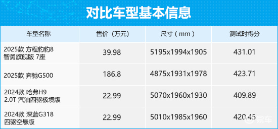 通过以上各项对比不难发现,本次选取的四款硬派造型中大型SUV在商品性方面均交出了令人满意的答卷。作为豪华品牌车型,奔驰G500在制动踏板宽度、座椅座垫长度以及后备厢开口面积等方面表现突出,展现出过人的人机工程学设计水准。深蓝G318在外部做工、噪音和振动抑制等方面均有着不错的表现。哈弗H9拥有较强的后雷达探测能力,提升日常用车的安全性和便利性。而方程豹豹8在多项测试中表现亮眼,综合产品力出众。总体而言,四款车在商品性方面都能满足日常使用需求,消费者可放心选购。