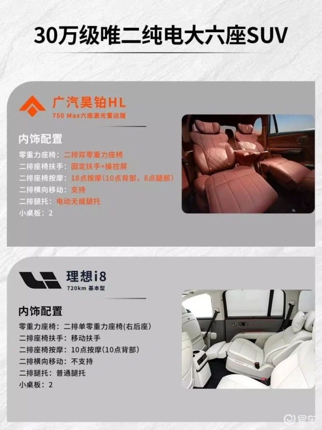 这笔钱省下来,能给二排加个小桌板(昊铂 HL 标配两个),孩子写作业、老人放茶杯都方便;也能选装激光雷达,高速上自动避让大货车时更安心。理想 i8 的基础版连座椅通风都要选装,算下来性价比差了一大截。