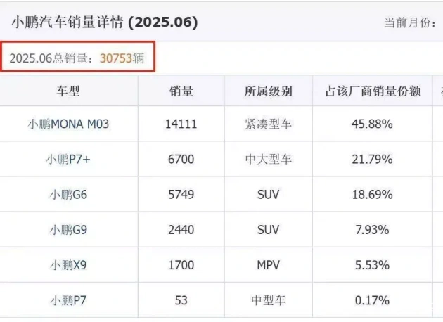 根据6月的数据,小鹏G6的销量为5749辆,G9的销量为2440辆。G7于7月初上市,与特斯拉Model Y和小米YU7形成错位竞争。