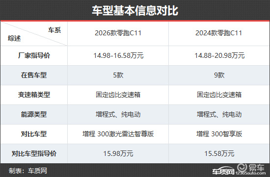 2026款零跑C11共推出5款配置车型,包含增程式和纯电动两种动力配置,售价区间为14.98-16.58万元。虽然入手门槛略微抬高了一些,但是顶配版车型的价格相较老款车型却更加亲民,并且车型数量也有所精简。本次选择的对比车型价格相近,以便能够更加直观地看出新老款车型在配置层面的具体差异。