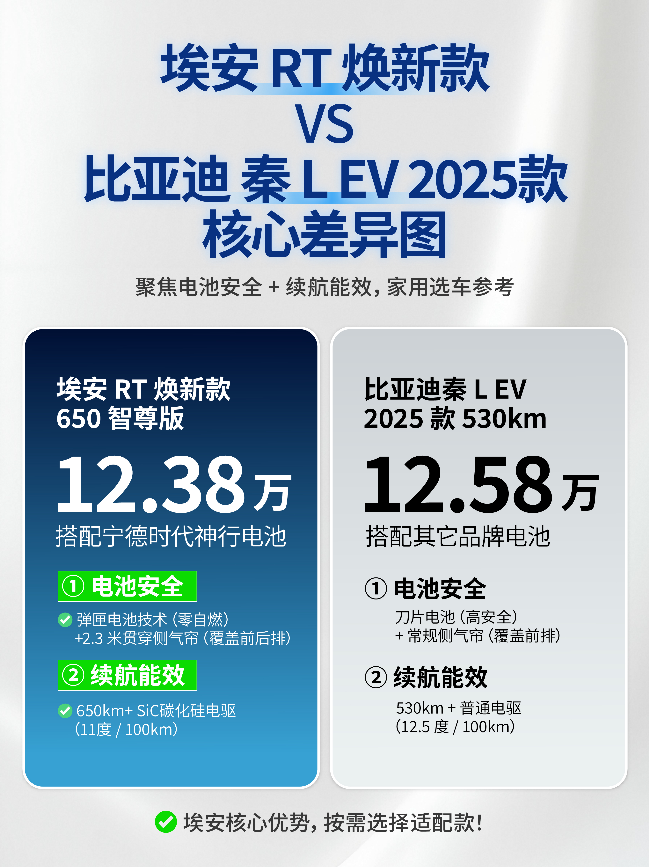 价格上两款差不多(埃安 12.38 万,秦 L EV 530km 版约 12.58 万),但埃安RT焕新款在 “安全 + 续航” 这两个家用核心点上更实在,带娃或常跨城的宝子,选埃安RT焕新款真的更省心~