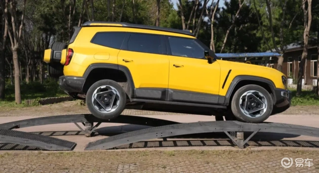 在交叉轴路况测试中,两车均能顺利通过,但在车身倾斜时,深蓝G318的后门能够顺利开启,而方程豹钛7在关闭时会因车身变形产生触碰门框的声音,这反映了深蓝G318车身刚度较高,为45000Nm/deg,而方程豹钛7为38000Nm/deg。在实际越野驾驶中,深蓝G318的车身结构更为坚固。