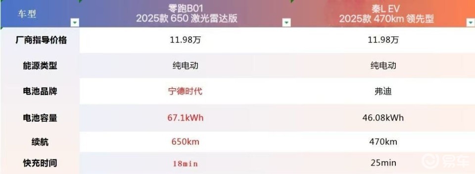 旗下车型零跑B01,刚上市不久月销量就连续两月轻松破1万台,今天我们就拿零跑B01和比亚迪秦L EV这款车做对比,两款车的价格差不多,但实际续航却相差非常大,如果你刚好预算在10万出头,想买纯电轿车,纠结怎么选的,下面说的可要好好看看。