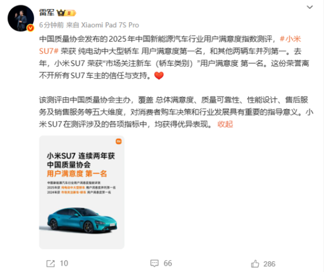 (原标题:雷军力作,小米SU7摘得纯电中大型轿车用户满意度桂冠)