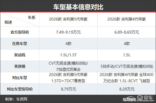 2026款吉利第5代帝豪共推出4款车型,在售车型数量和2026款吉利第4代帝豪一致。新款车型的官方起售价和顶配售价相比老款车型虽略有增加,但在限时感恩价优惠政策下,全系价格均下降9000元,反而比老款车型更实惠。本次对比均选择了次顶配版本,以便能够更加直观地看出新老款车型在配置层面的具体差异。