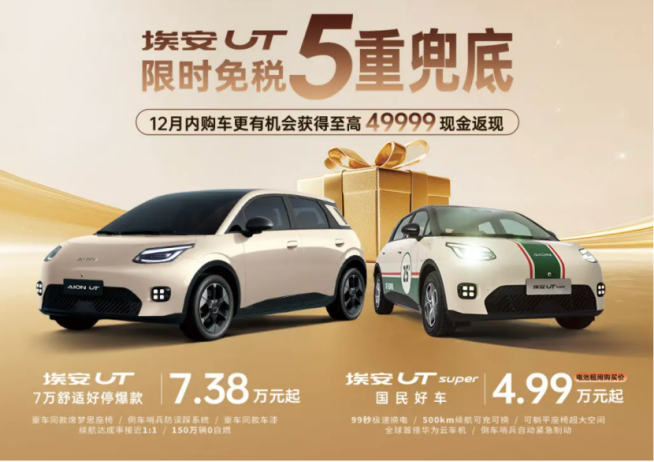名爵 MG4 凭借欧系设计语言、后置后驱的运动布局和丰富的续航版本选择,成功吸引了追求驾驶乐趣、偏爱运动风格的年轻消费者。而 AION UT 则精准切中家庭用户的核心诉求,在空间实用性、乘坐舒适性、主被动安全配置上优势显著,再加上跨年购置税全免、灵活金融方案、至高 49999 元现金返现等丰厚购车权益,以及三电终身质保、免费充电桩等用车保障,从购车到用车全周期降低成本。如果你更看重家庭出行的实用性、舒适性与全方位安全保障,同时想抓住年底的真金白银优惠,AION UT 无疑是 10 万预算内的优选。