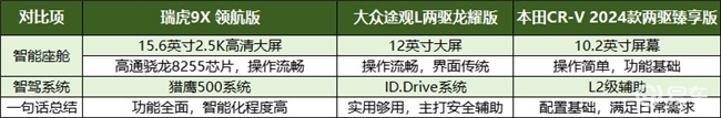 对于既钟情于传统燃油车成熟可靠的动力体验,又渴望享受前沿科技带来的便捷与安全的消费者而言,“智驾燃油车”正成为市场的新宠。那么,在琳琅满目的燃油车市场中,究竟智驾燃油车哪款好用?今天,我们将聚焦三款热门SUV——瑞虎9X领航版、大众途观L两驱龙耀版和本田CR-V 2024款两驱臻享版,从智能配置、空间表现到动力系统进行全方位对比,为您揭晓“智驾最好燃油车是哪款”的答案。