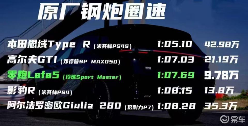 要知道在知名博主的场景测试中,零跑Lafa5在场地圈速的测试成绩中,也基本和高尔夫GTI持平了,要知道这是原厂轮胎下跑出的圈速。而在更换抓地力更好的轮胎后,零跑Lafa5也是跑出了1分03秒多点的成绩,这个表现可是让很多主打运动性能的高端车都脸面全无!