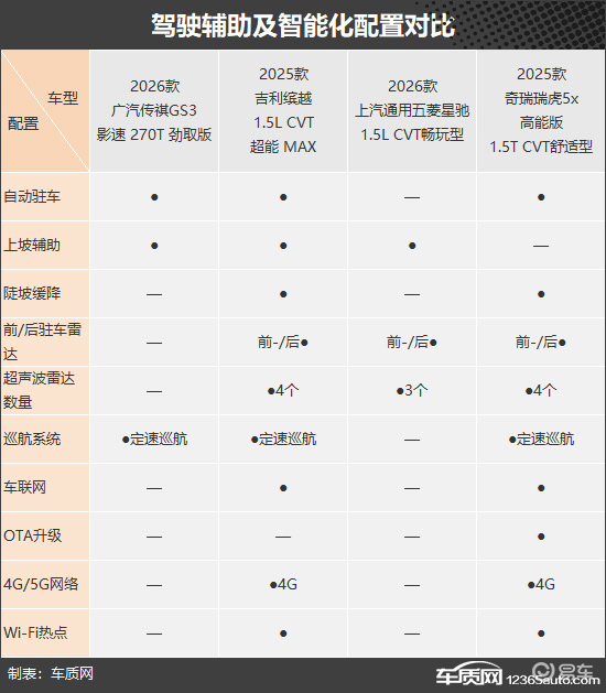 驾驶辅助方面,四款车型均不具备L2级辅助驾驶能力,五菱星驰甚至连基础的定速巡航都未配备。智能化配置部分,吉利缤越和瑞虎5x的整体表现明显更好,均支持4G网络以及Wi-Fi热点。其中,瑞虎5x搭载的车机系统还能够进行OTA升级。