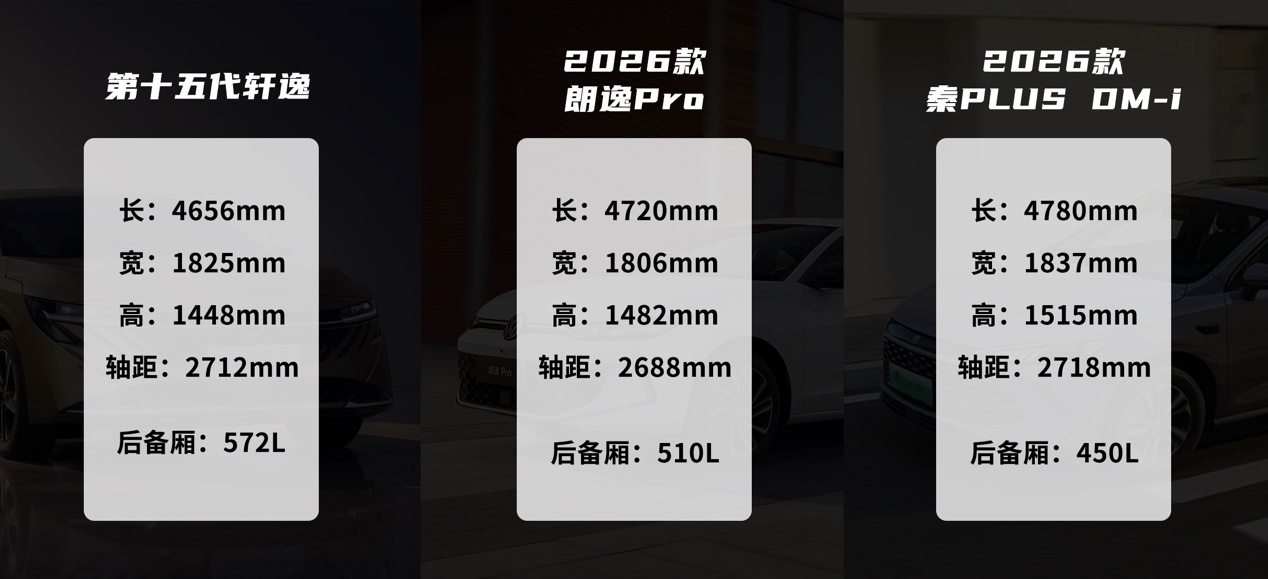 本次参与横向评测的具体车型分别为:第十五代轩逸、2026款朗逸Pro,以及2026款秦PLUS DM-i。