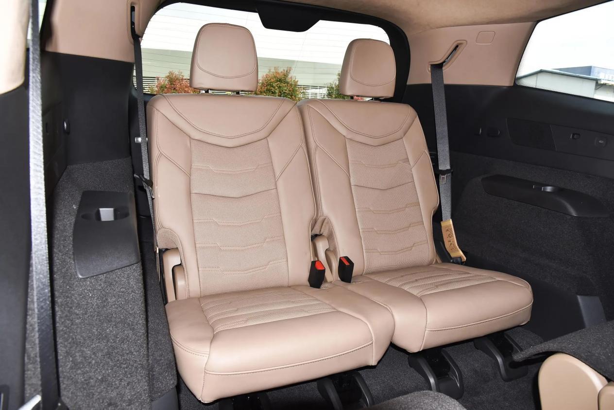 乘坐体验上,身高175厘米乘员在前中后排都能有一定的头部空间余量,相对来说,第一排和第二排明显要更宽裕,第三排不顶头,但剩余空间不多,第二排座椅支持前后调节,调至最后时,腿部空间接近3拳。