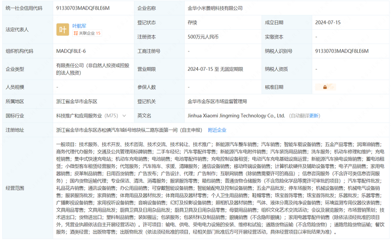 (原标题:小米景明在金华成立新公司,注册资本500万元)