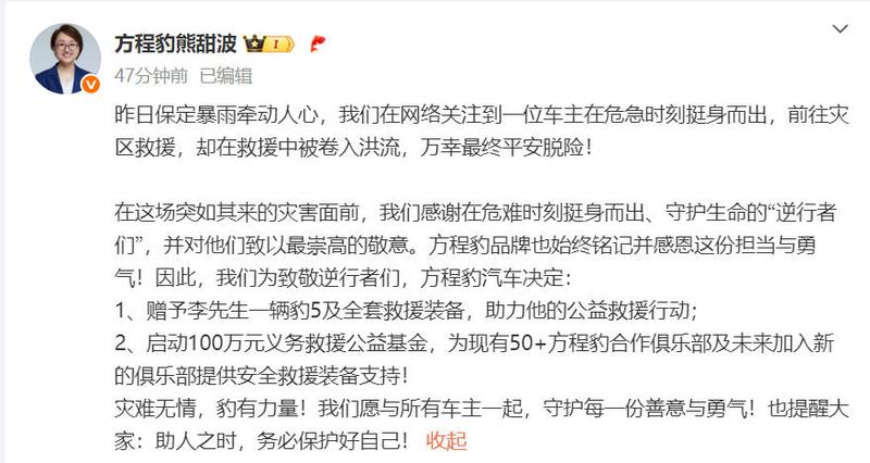 (原标题:方程豹:赠予暴雨救援车主一辆豹5,启动100万元救援公益基金)