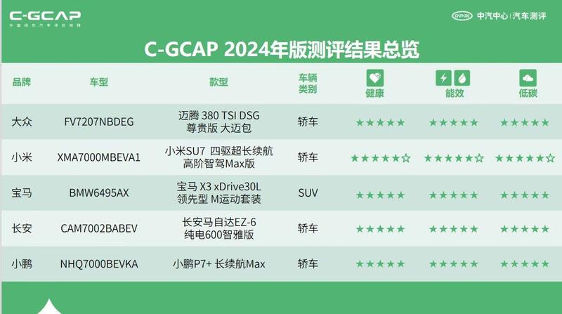 易车讯 7月25日,中汽中心汽车测评管理中心(以下简称 “中汽测评”)发布中国绿色汽车评价规程C-GCAP最新一批车型的测评成绩,车型包括大众迈腾、小米SU7、宝马X3、马自达EZ-6以及小鹏P7+共计5款市场热门车型。
