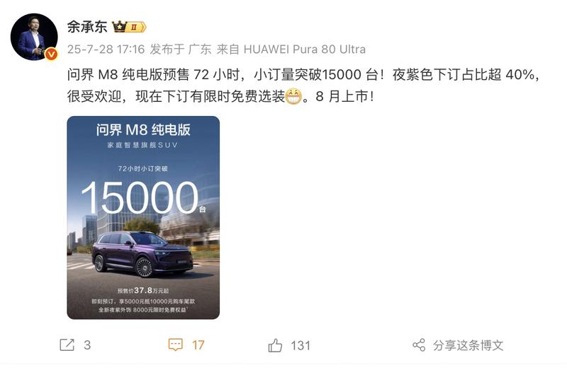 易车讯 7月28日,华为常务董事、终端BG董事长余承东在社交媒体上宣布,问界M8纯电版预售72小时,小订量突破15000台,夜紫色下订占比超40%,新车将于8月正式上市。
