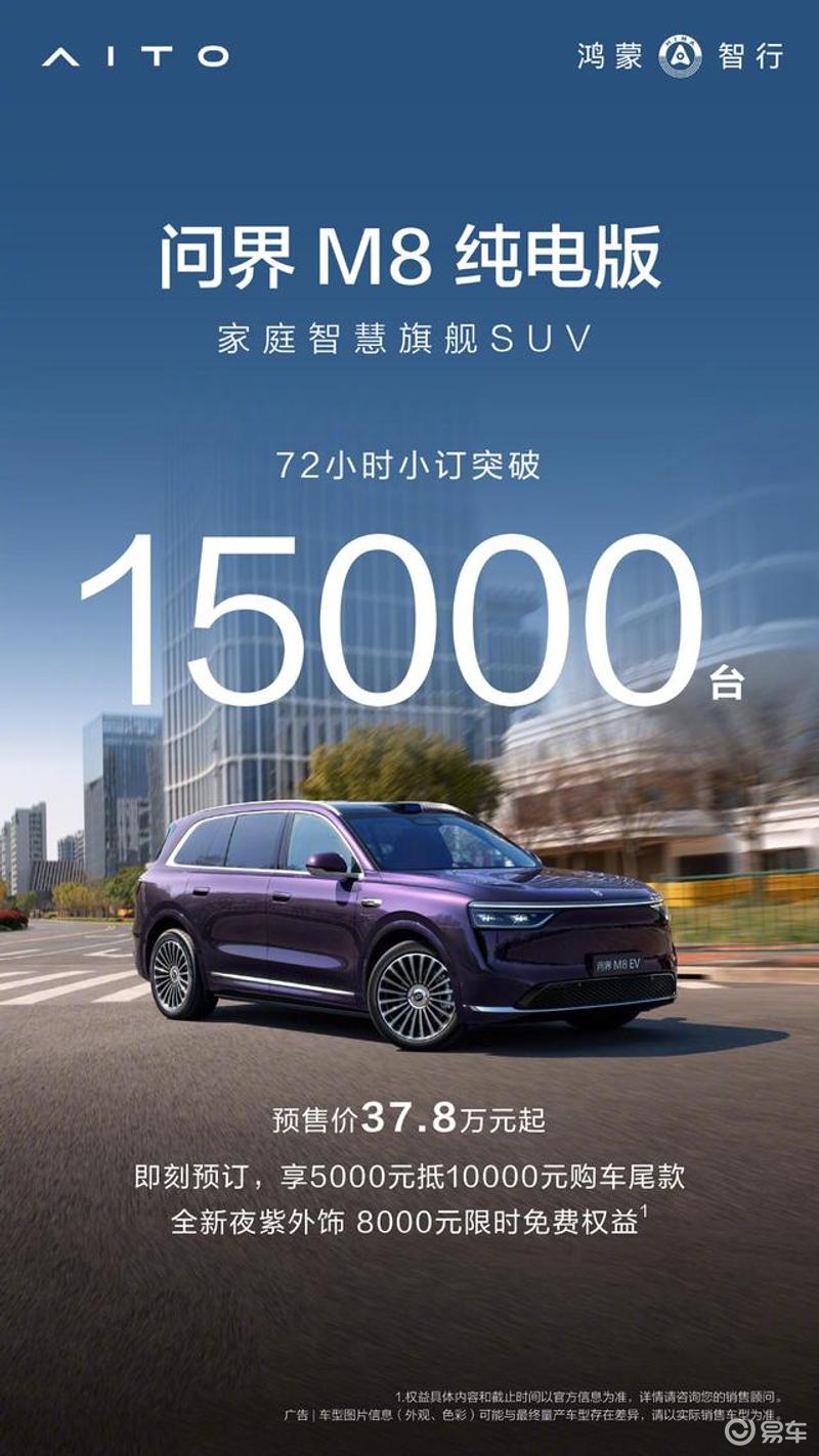 问界M8纯电版预售72小时小订突破1.5万台,将于8月上市
