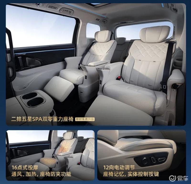 此外,新车还搭载过道版五星SPA双零重力座椅,采用全粒面NAPPA真皮,座垫的宽度、长度分别为546mm和525mm,靠背宽度、长度则为534mm和720mm。该座椅拥有12向电动调节,座椅记忆,实体控制按键,并具备16点式按摩,通风、加热,防夹功能。