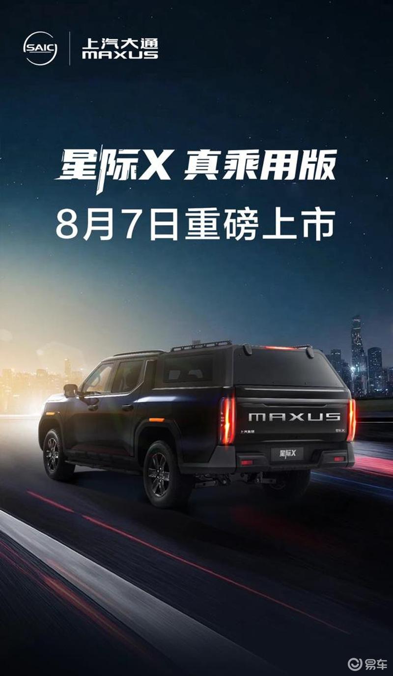易车讯 我们从上汽大通官方获悉,星际X真乘用版将于8月7日正式上市。星际X真乘用版基于星际X搭载,新车最大的亮点是既可以享受乘用车权限,又保留越野皮卡基因,可享受个人上牌不受限、享受6年免检政策、无15年强制报废限制,节假日高速通行免费等。