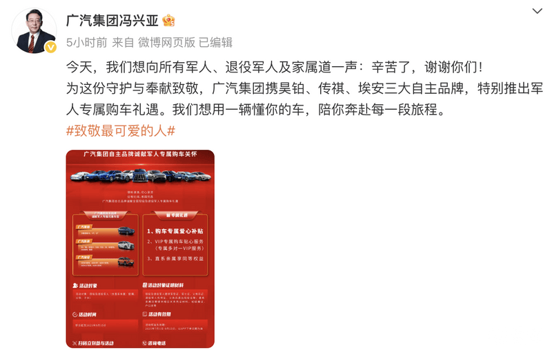 易车讯 今日,广汽集团董事长冯兴亚发文称:广汽集团携昊铂、传祺、埃安三大自主品牌,特别推出军人专属购车礼遇。据悉,符合条件的消费者购买广汽传祺、广汽埃安、广汽昊铂指定车型,可享额外补贴至高3000元。