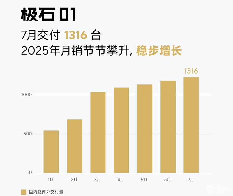 易车讯 日前,极石汽车公布,2025年7月交付1316台极石01车型,上月交付1259台。极石汽车目前仅有极石01一款车型在售。