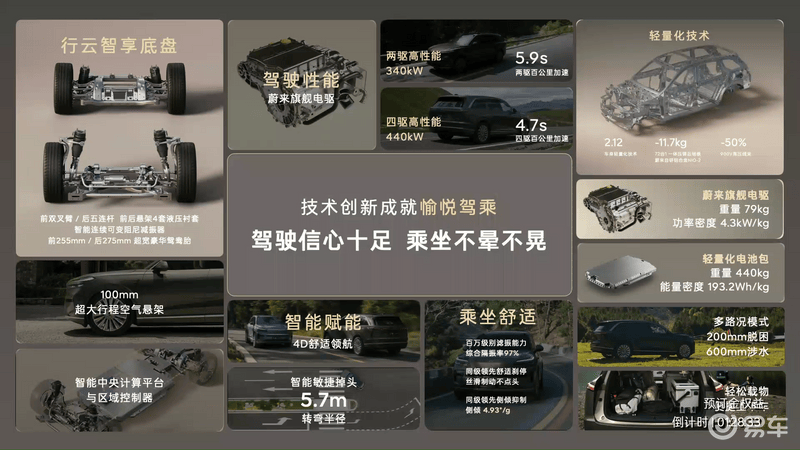 乐道L60拥有同级最优的座舱可用空间效率,头等舱式的座椅宽肩设计,提供完美的舒适坐姿和体感。二排右侧尊享零重力座椅,超大空间无需横移,一键进入零重力姿态。坐垫与靠背压力平均分布,带来极致的休憩享受。乐道L90作为一款纯电大型SUV,是轻量化水平最高的大三排SUV,白车身质量433.8kg,整车质量仅为2250kg。