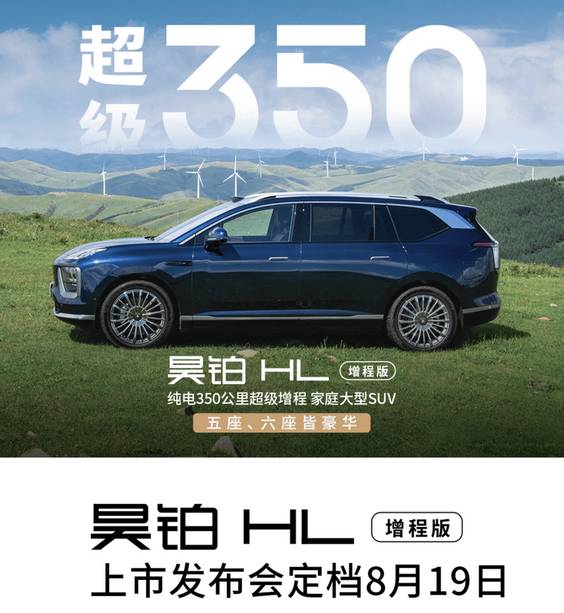 (原标题:昊铂HL增程版将于8月19日上市,纯电续航可达350km)