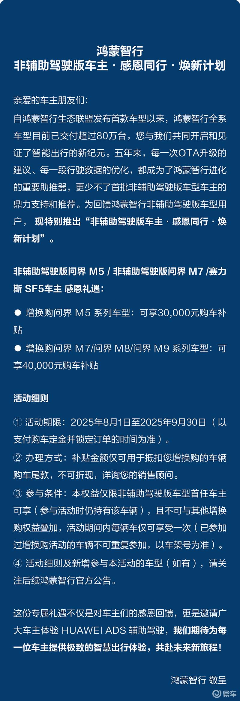 易车讯 近日,鸿蒙智行推出“非辅助驾驶版车主・感恩同行・焕新计划”。非辅助驾驶版问界M5/问界m7/赛力斯SF5车主,增换购问界M5系列车型:可享30000元购车补贴。增换购问界M7/问界M8/问界M9系列车型:可享40000元购车补贴。