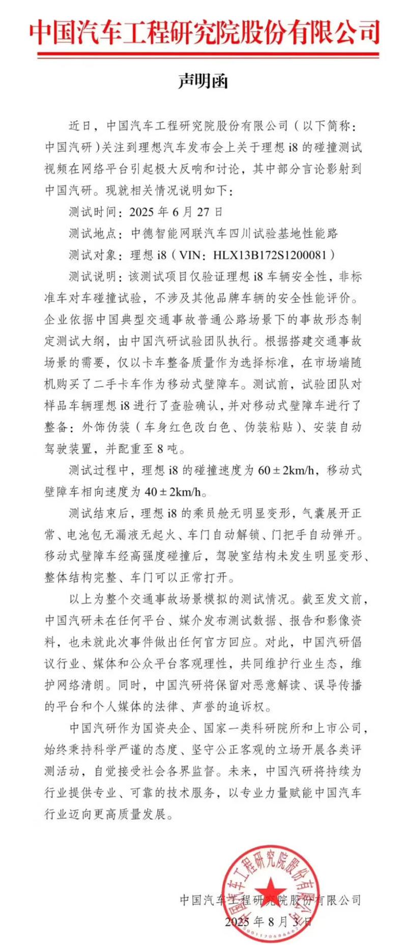 近日,中国汽车工程研究院股份有限公司(以下简称:中国汽研)关注到理想汽车发布会上关于理想i8的碰撞测试视频在网络平台引起极大反响和讨论,其中部分言论影射到中国汽研。现就相关情况说明如下: