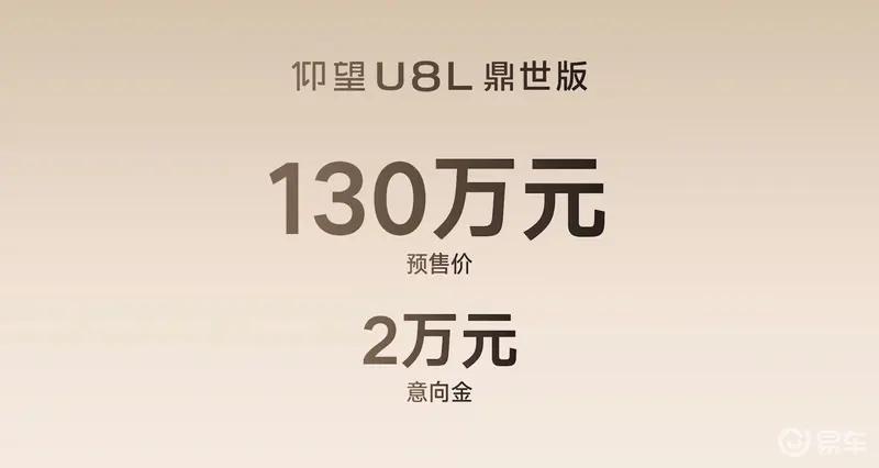 易车讯 我们从仰望汽车官方获悉,仰望U8L鼎世版预计将于今年三季度上市。仰望U8L鼎世版于7月31日开启预售,预售价130万元,预订意向金2万元。即日起至上市前一天24点,支付意向金用户可享价值3万元选装基金。