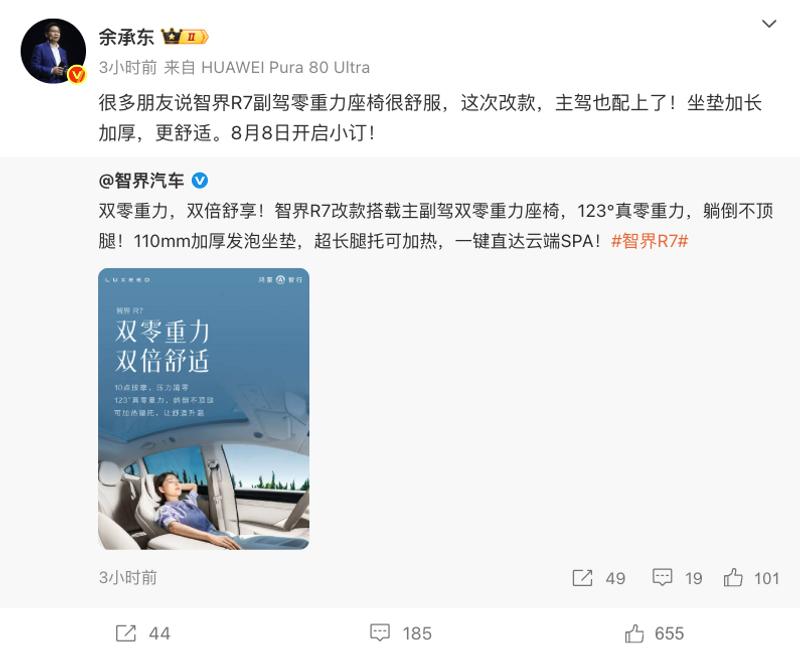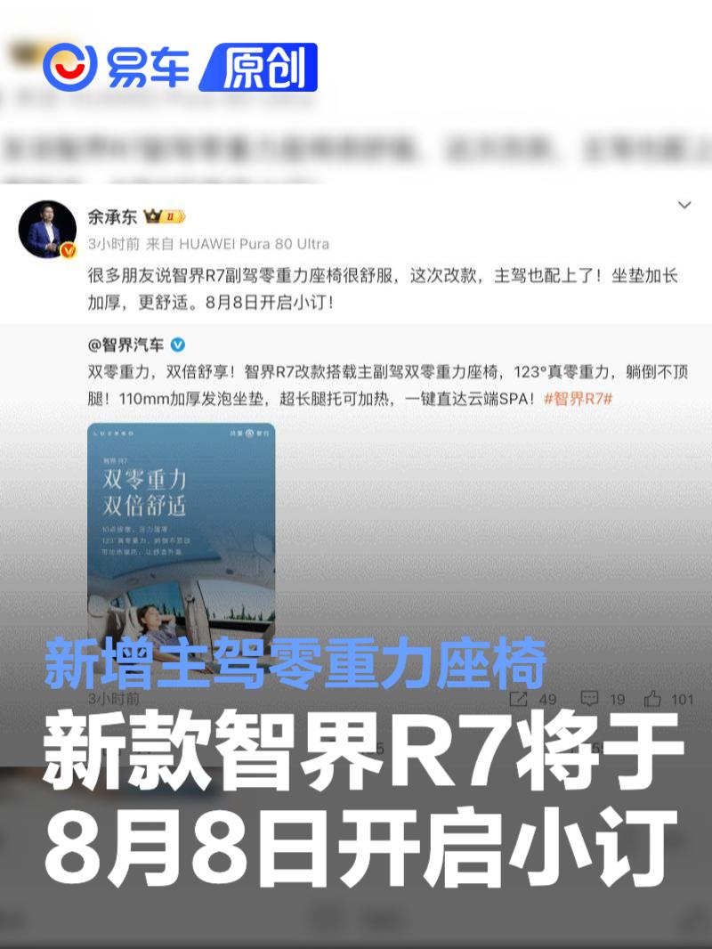 易车讯 8月3日,华为常务董事、终端BG董事长余承东在微博上表示,很多朋友说智界R7副驾零重力座椅很舒服,这次改款,主驾也配上了!坐垫加长加厚,更舒适。8月8日开启小订。